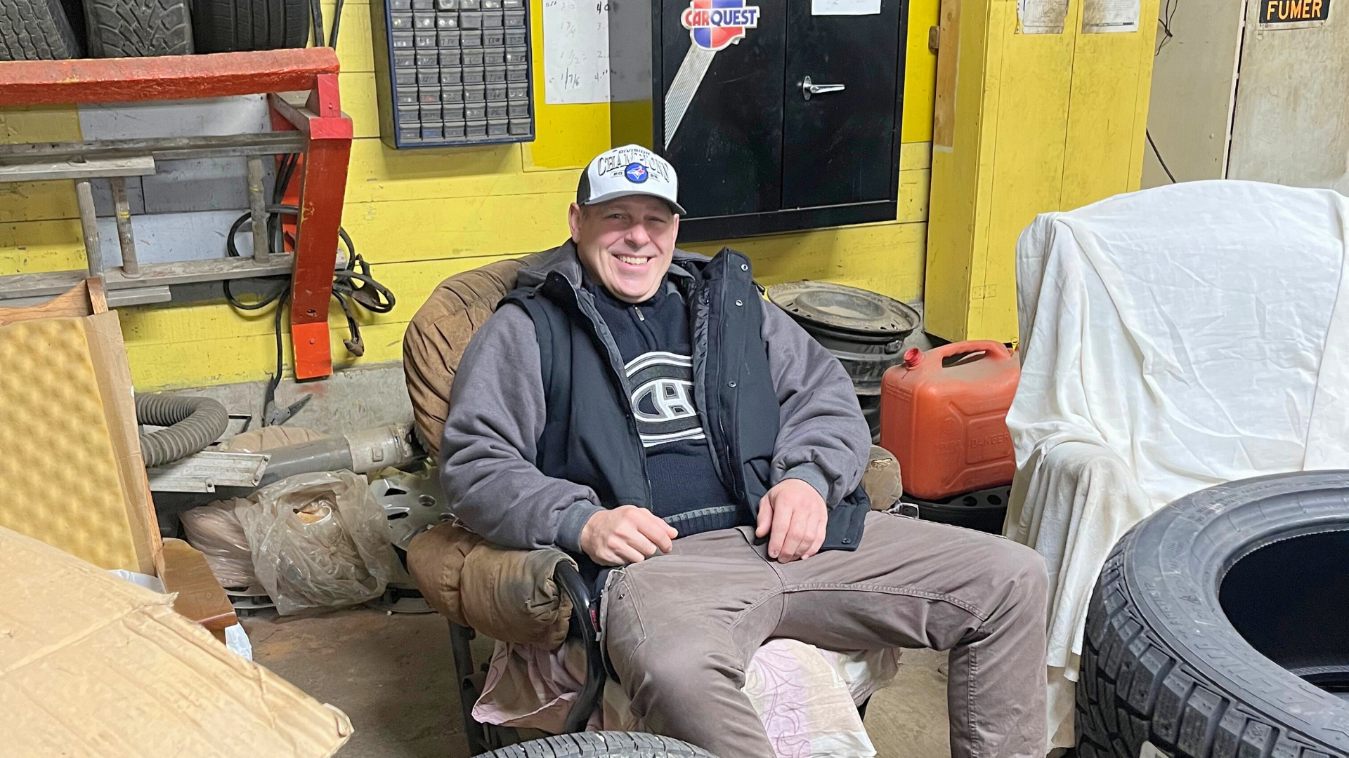 De retour à la maison, j’en profite pour me faire un bon sandwich avec le pain bourratif de la famille de Sébastien. Je me dépêche puisqu’après le dîner, je dois rouler sur deux municipalités pour me rendre à mon changement d’huile chez Jacques, le fidèle garagiste de mon village natal où je me suis toujours senti chez moi. Pendant, je discute avec deux autres clients, bien assis sur ma chaise berçante (oui, oui! ma chaise berçante, une des 4 installées afin de créer une atmosphère qui engendre la jasette), dans ce lieu qui a gardé son cachet d’antan.