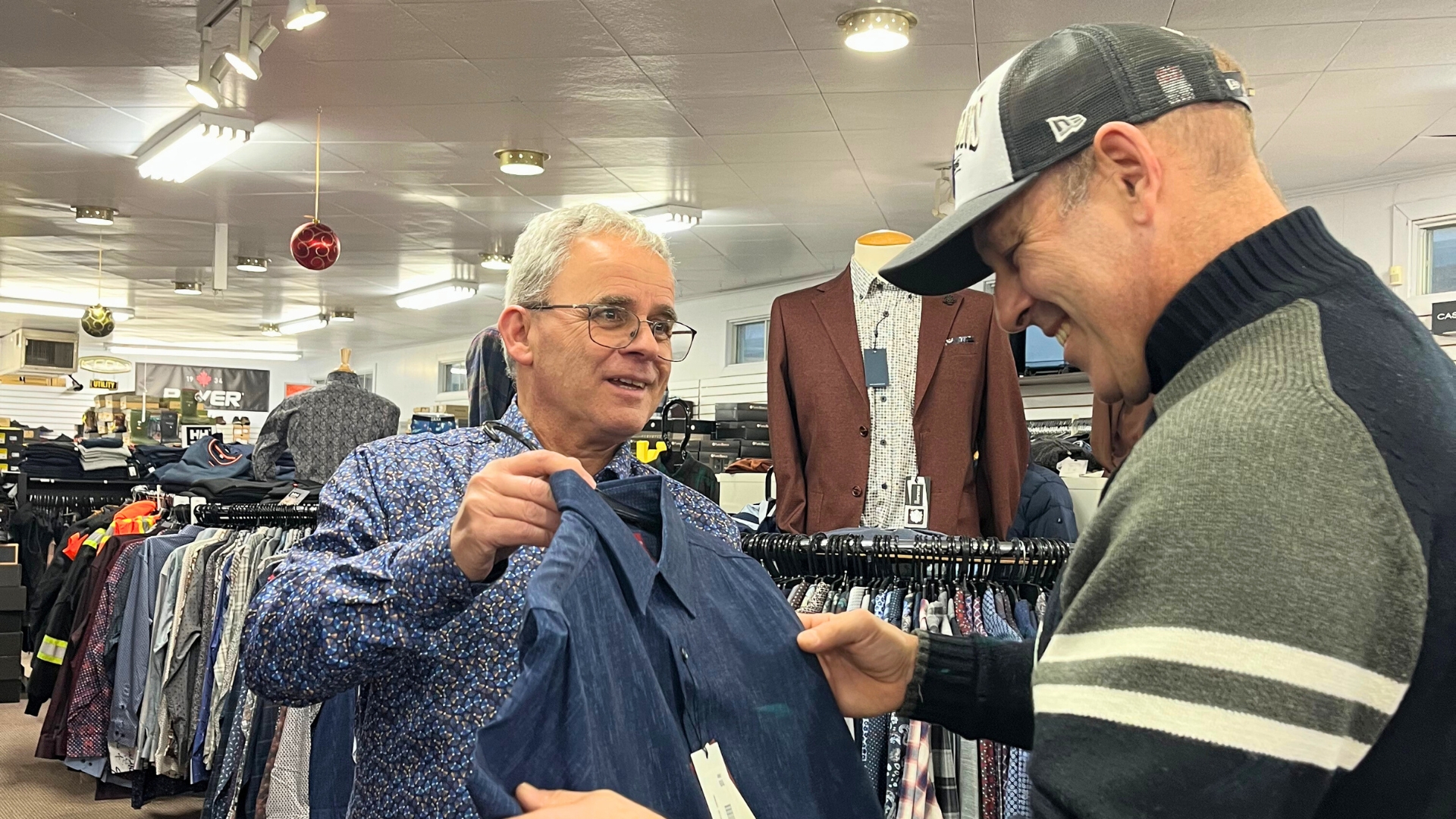 Pourquoi pas un p’tit arrêt à la boutique de vêtements pour voir Jean-Yves? Qui lui, se doute que c’est le magicien qui débarque acheter une chemise et spécialement un nœud papillon question de revamper sa garde-robe pour ses contrats du temps des fêtes, un classique.