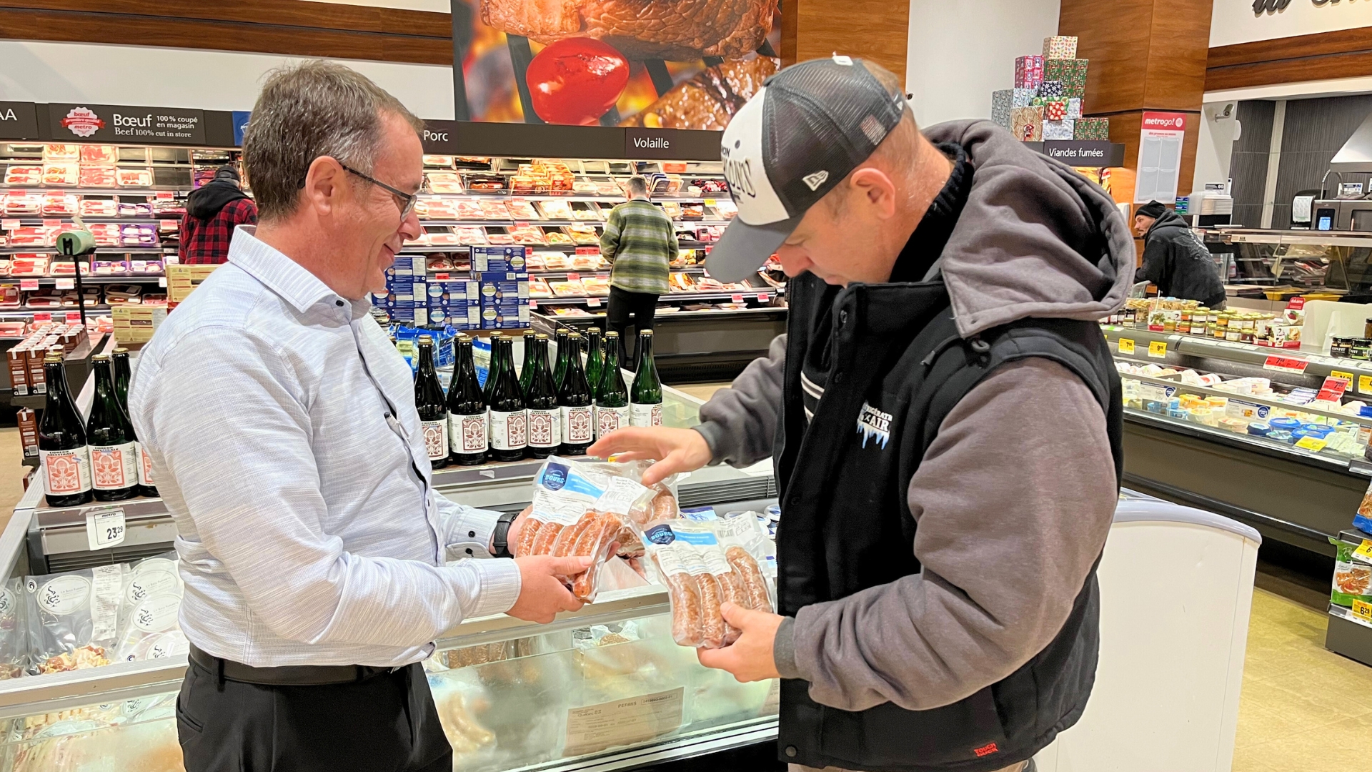 Rendu à la voiture, je constate que parler de gros gibier m’a donné faim et une idée s’invite dans ma tête, pourquoi ne pas manger des bonnes saucisses locales pour souper? J’appelle ma conjointe pour lui dire de ne rien préparer et ne fais ni un ni deux pour atterrir chez Steeve, l’autre épicier, puisque sachant qu’Éric à Mimi est trop débordé à débiter les trophées de nos chasseurs, j’en profite pour m’acheter ses fameuses saucisses.