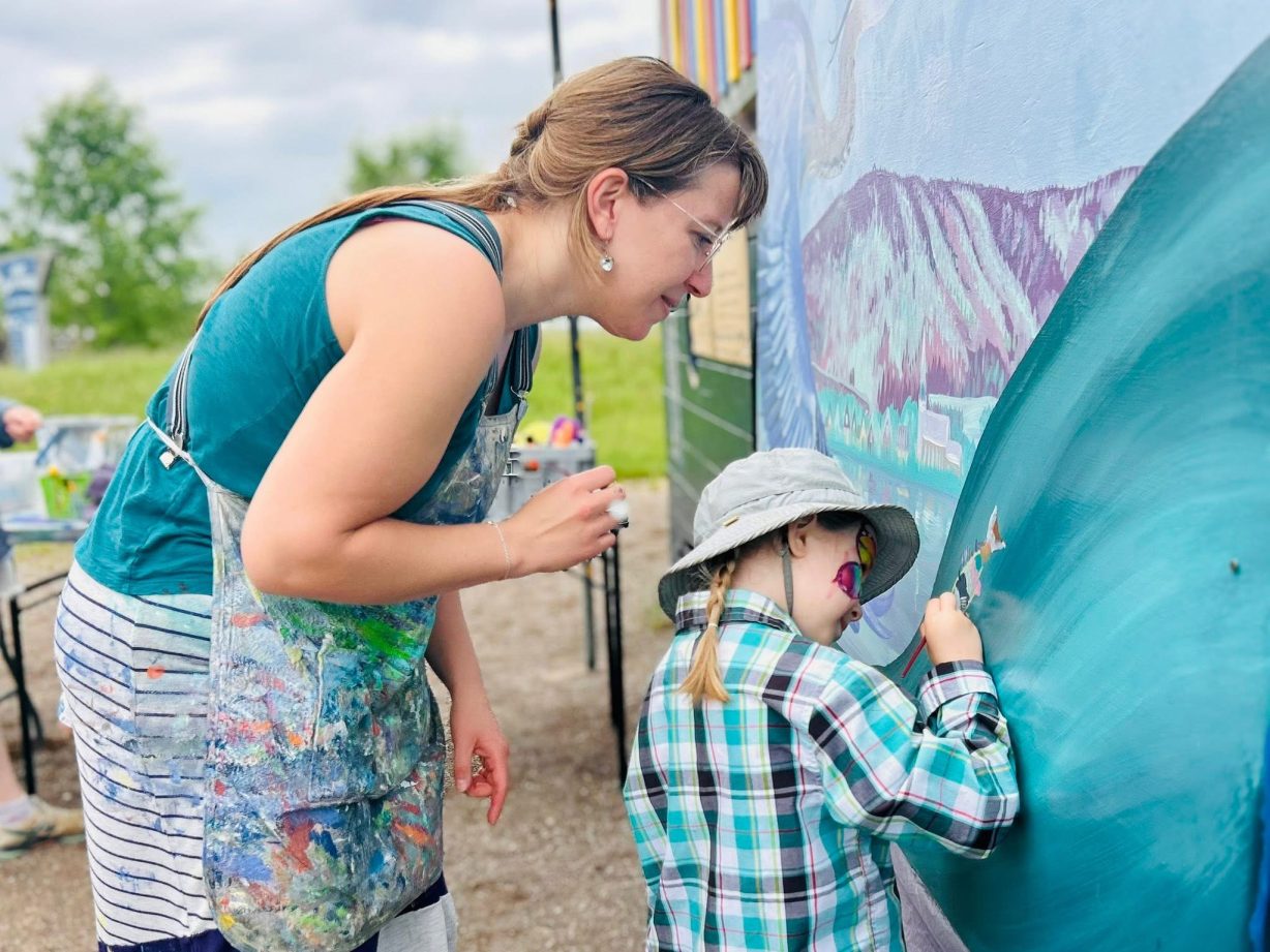 J’ai réalisé une autre murale de 100 pieds par 30 à New Richmond où j’ai invité 380 enfants à laisser leur trace en peignant leur main sur un arrosoir gigantesque. L’œuvre est visible à l’École Le Bois Vivant et présente des enfants dans un décor de nature fantaisiste.